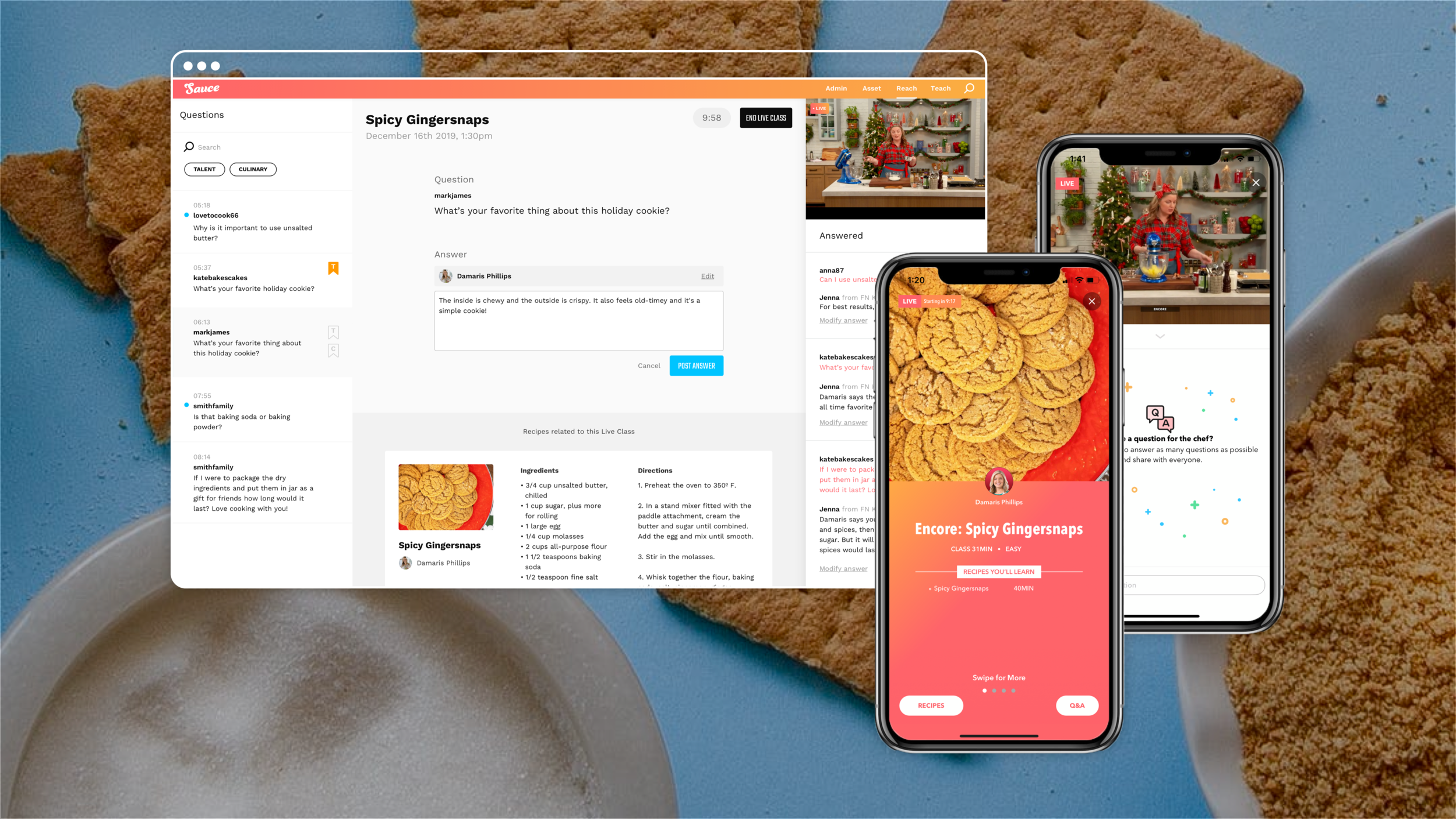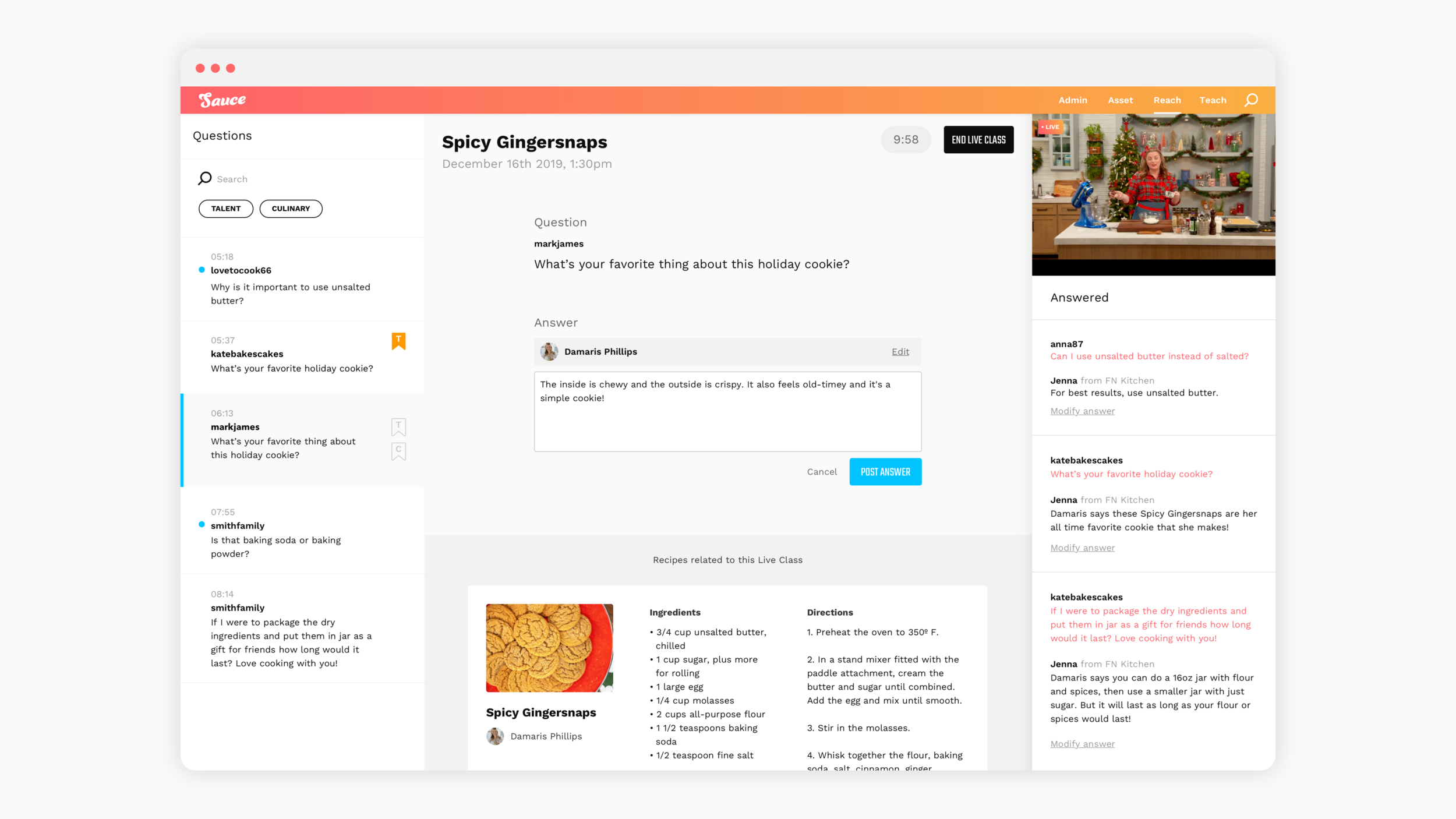 The Live Class Q+A moderation view allows our editorial team to manage Live Class interaction from a single interface, with access to the live-streamed video, inbox of user questions, and access to the recipe(s) mentioned in the live class.