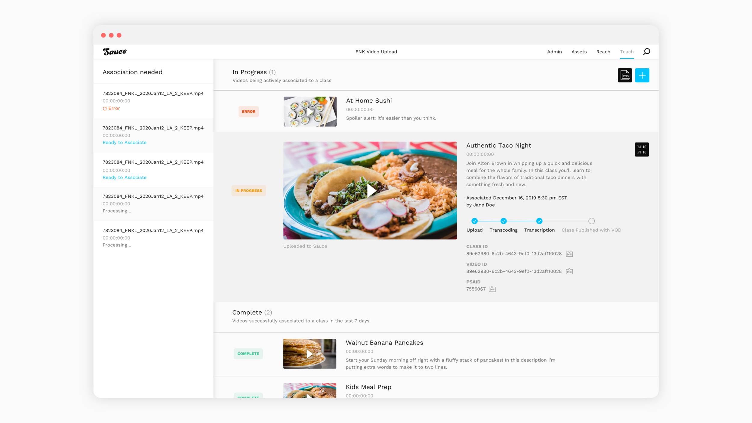 Sauce’s Video Asset Manager provides users with an interface to upload, manage, and publish video content for Food Network Kitchen Classes, Courses, How-To’s, and Recipes.