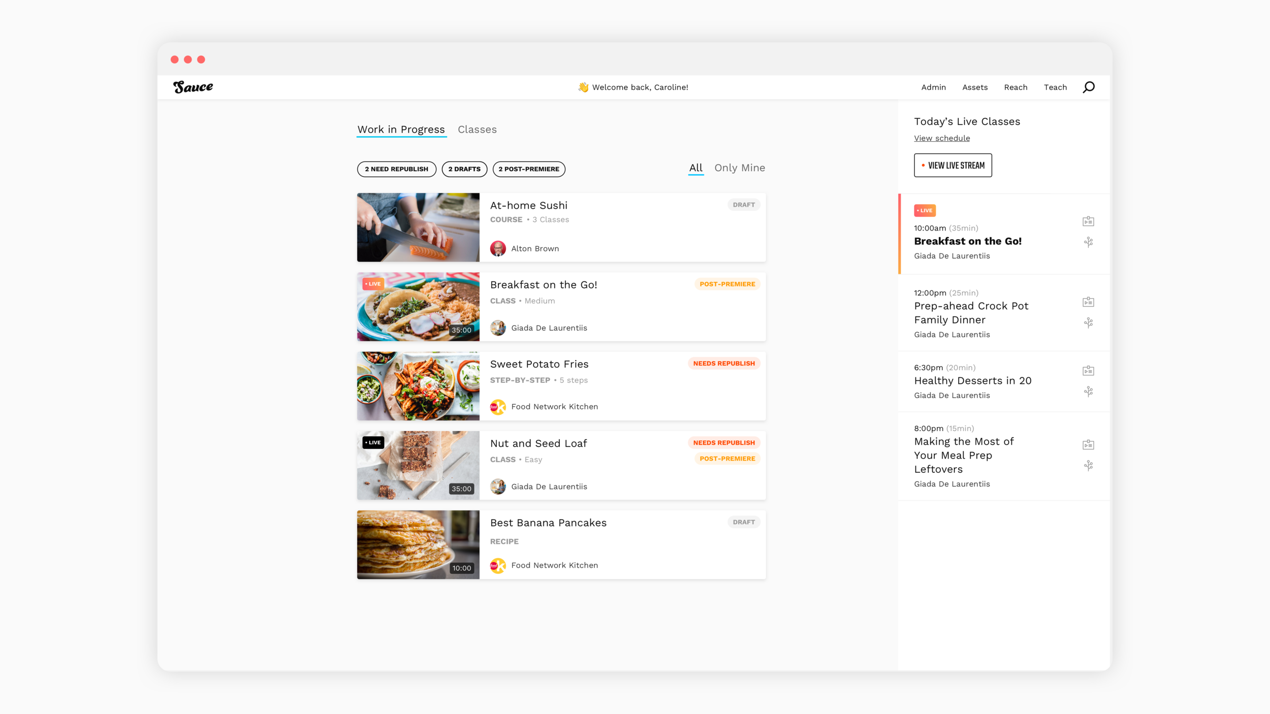The Sauce user dashboard is tailored to each individual’s editorial role and respective workflow, while maintaining a zoomed-out context of timely contextual information like the live class schedule.